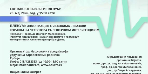 Успешно завршен XXII Конгрес Националне асоцијације удружења здравствених радника Србије са међународним учешћем који се одржао у периоду од 09. до 12. октобра 2025. године у Хотелу Фонтана у Врњачкој Бањи. Пленарна тема Конгреса била је Савремени принципи терапије прехладе и грипа, предавача Проф.др Дејана Ружић Зечевић, УКЦ Крагујевац, Факултет медицинских наука, Универзитет у Крагујевцу.…