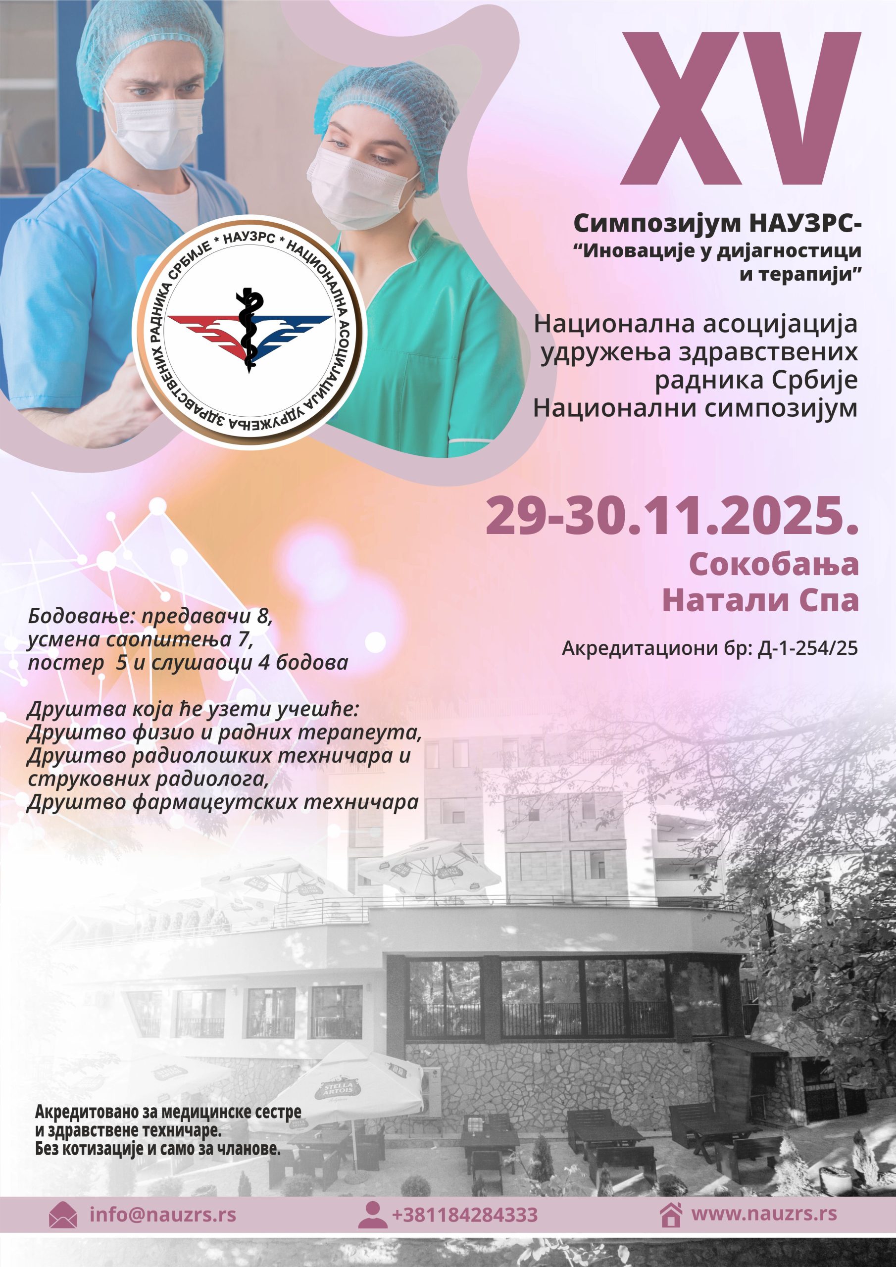 Добро дошли на XV Симпозијум Друштава НАУЗРС „Иновације у дијагностици и терапији„ који се одржава у Соко бањи у Хотелу ”Натали Спа” од 29. до 30. новембра 2025. године.