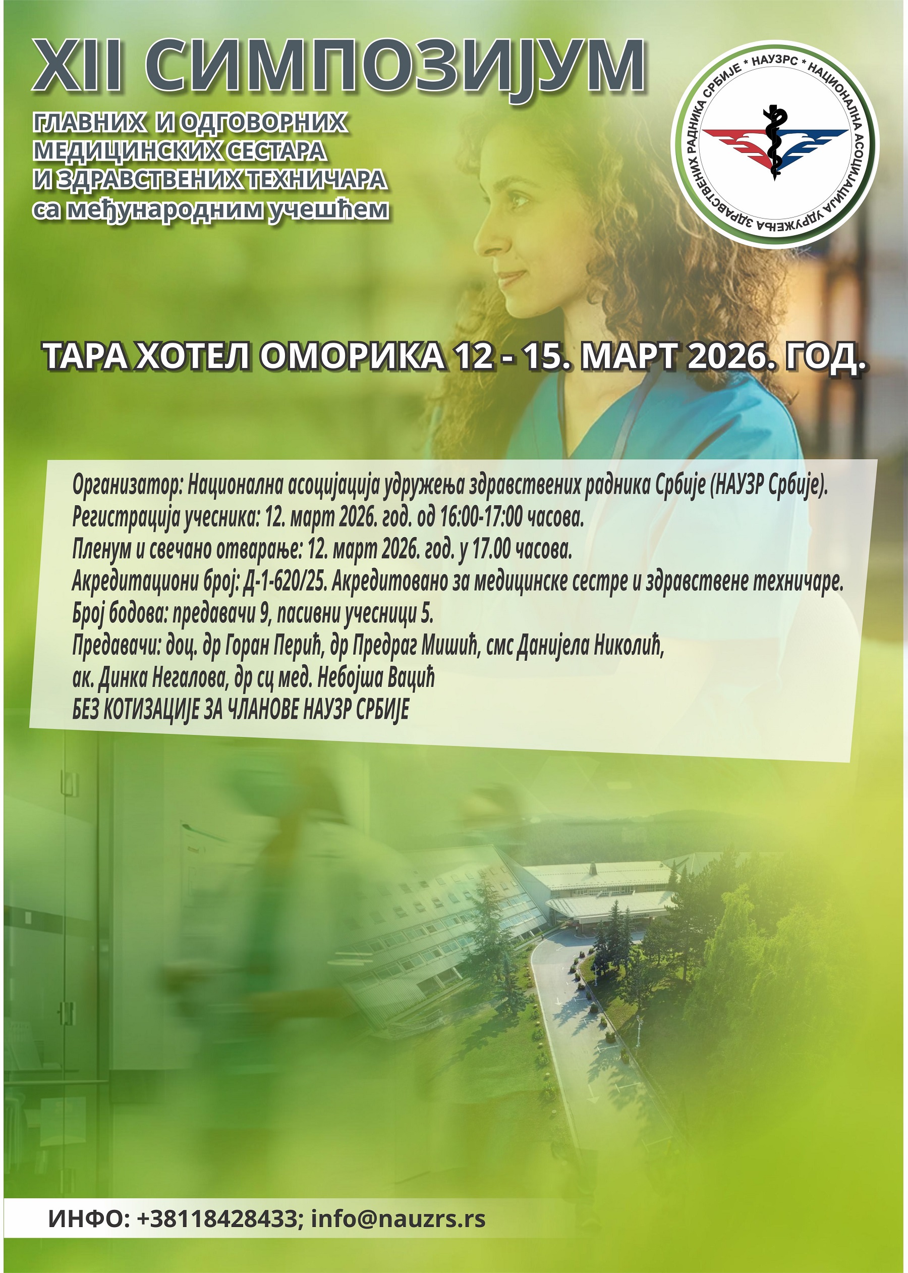 Добро дошли на XII симпозијум главних и одговорних медицинских сестара и здравствених техничара НАУЗРС са међународним учешћем који се одржава на Тари у Хотелу ”Оморика” од 12. до 15. марта 2026. године.